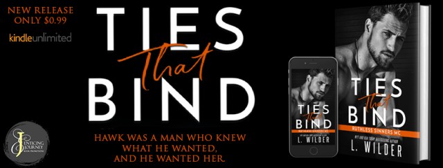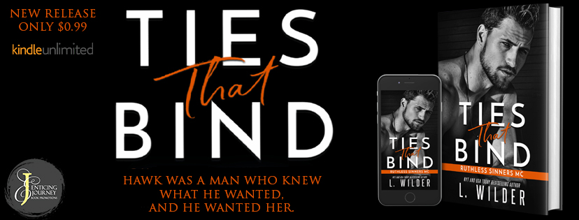 This is Hawk’s story- Book 1 of L. Wilder’s new Ruthless Sinners crossover series. Ties That Bind is a standalone MC romance with a group of bikers who will take you on a hell of a ride. They’re foul-mouthed, possessive alphas who will stop at nothing to protect their women. No cheating and a HEA.